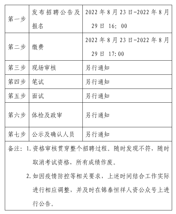 ?2022年8月23日-2022年8月29日 16:00在錦泰恒祥人資官網(www.jthxhr.com)、“錦泰恒祥人資”微信公眾號、“國控集團”官方網站(www.yiyuankaituan.com)及上級部門要求的相關網站等發布招聘公告。