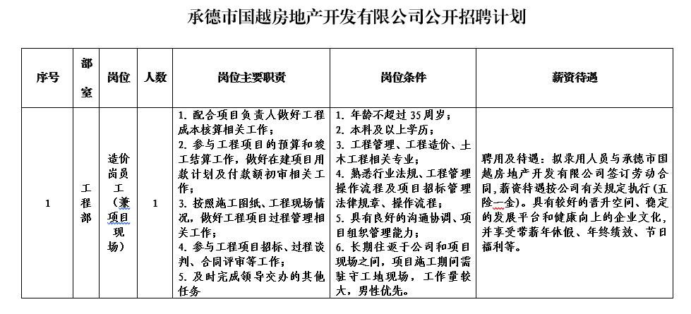 本次擬招聘1個崗位共計1人。具體應聘條件見附件《承德市國越房地產開發有限公司公開招聘計劃表》 。