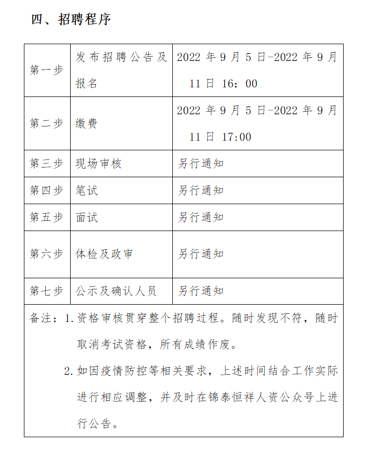 ?2022年9月5日-2022年9月11日16:00 在錦泰恒祥人資官網(www.jthxhr.com)、“錦泰恒祥人力資源服務有限公司”微信公眾號、“國控集團”官方網站(www.yiyuankaituan.com)及上級部門要求的相關網站等發布招聘公告。