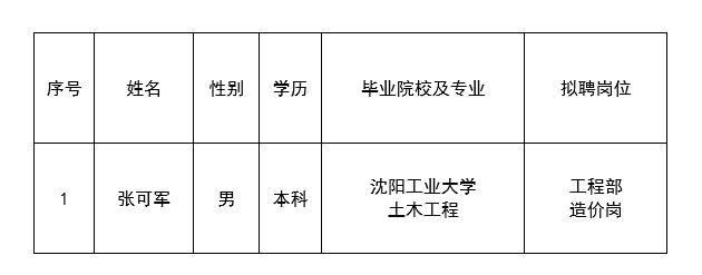 因公司發展需要,承德市國越房地產開發有限公司委托第三方機構面向社會公開工程部造價崗員工1名。現對擬錄用人員信息進行公示,公示期間如有異議,可通過電話、信函等方式反映,反映意見請署真實姓名。